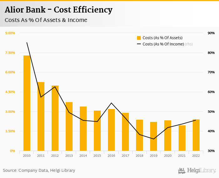 Comparing Alior Bank with its closest peers, PKO BP operated in 2022 with a cost to income ratio of 45.1% in 2022, Pekao reached 54.5% and ING Bank Slaski some 55.7%.