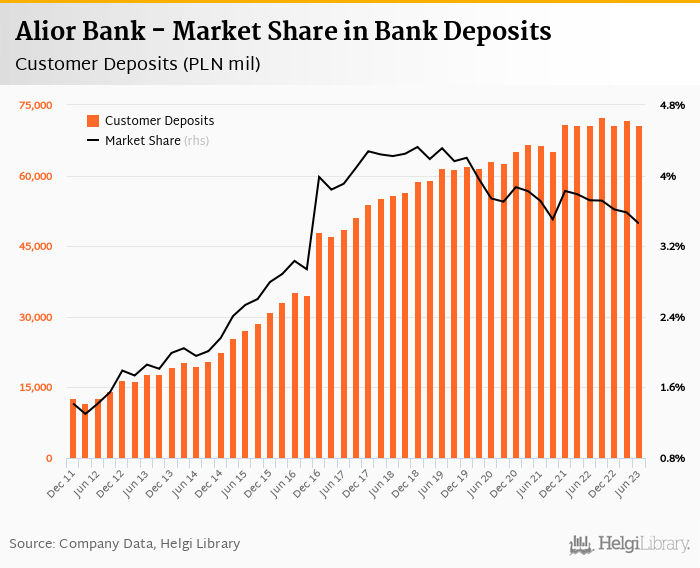 Alior Bank's customer deposits reached PLN 70,706 mil in 2023-06-30, down 1.60% compared to the previous year.
