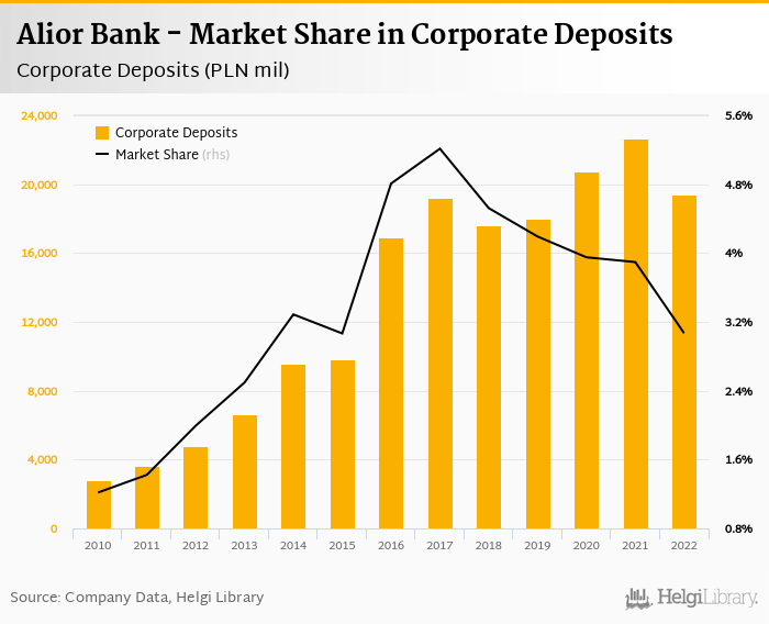 Alior Bank's corporate deposits reached PLN 19,432 mil in 2022, down 14.3% compared to the previous year.