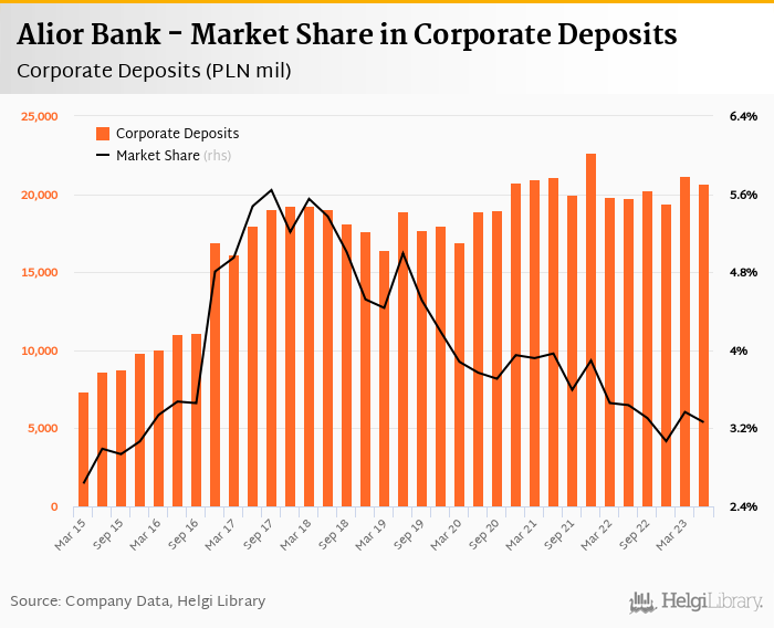 Alior Bank's corporate deposits reached PLN 20,670 mil in 2023-06-30, down 2.31% compared to the previous year.
