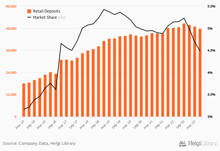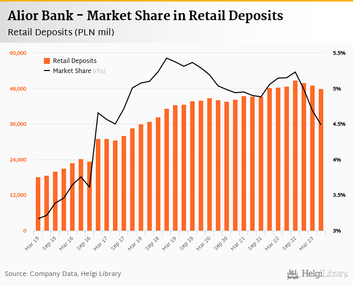 Alior Bank's retail deposits reached PLN 47,935 mil in 2023-06-30, down 2.44% compared to the previous year.