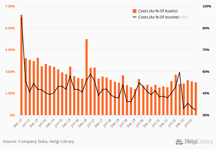 Historically, the bank’s costs reached an all time high of 97.3% of income in 4Q2012 and an all time low of 33.4% in 3Q2023.