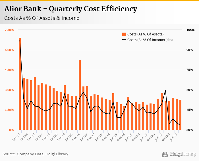Alior Bank's cost to income ratio reached 33.4% in the third quarter of 2023, down from 35.3% when compared to the previous quarter.