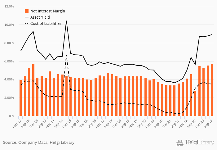 Historically, the bank’s net interest margin reached an all time high of 5.74% in 3Q2023 and an all time low of 2.79% in 3Q2022. The average margin in the last six quarters amounted to 4.90%.