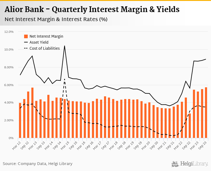 Alior Bank's net interest margin amounted to 5.74% in the third quarter of 2023, up from 5.53% when compared to the previous quarter.