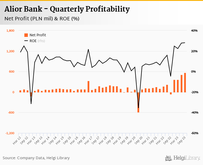 Alior Bank made a net profit of PLN 572 mil in the third quarter of 2023, up 1% when compared to the same period of last year. This implies a return on equity of 28.1%.