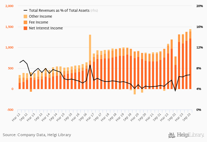Bank's total revenues accounted for 6.72% total assets in the third quarter of 2023, up from 3.65% a year earlier.
