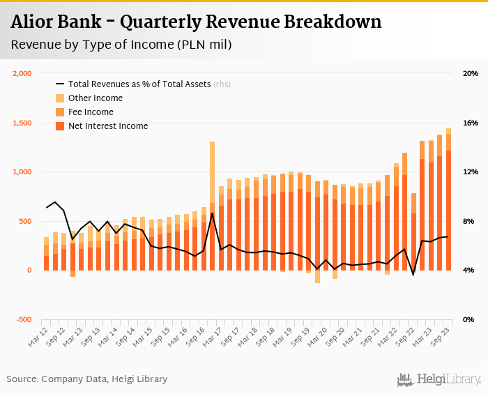 Alior Bank generated total banking revenues of PLN 1,450 mil in the third quarter of 2023, up 89.1% when compared to the same period of last year and 4.65% when compared to the previous quarter.