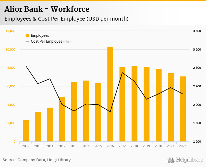Alior Bank employed 7,074 persons in 2022, down 4.93% when compared to the previous year. Historically, the bank's workforce hit an all time high of 10,245 persons in 2016 and an all time low of 2,342 in 2009.