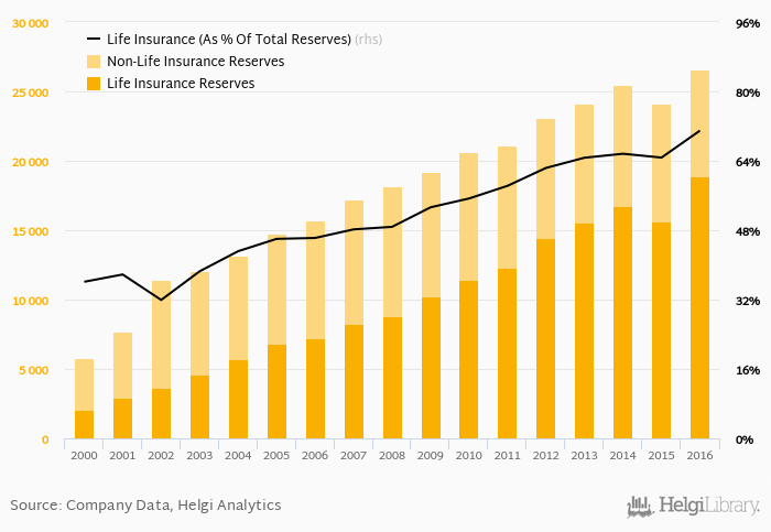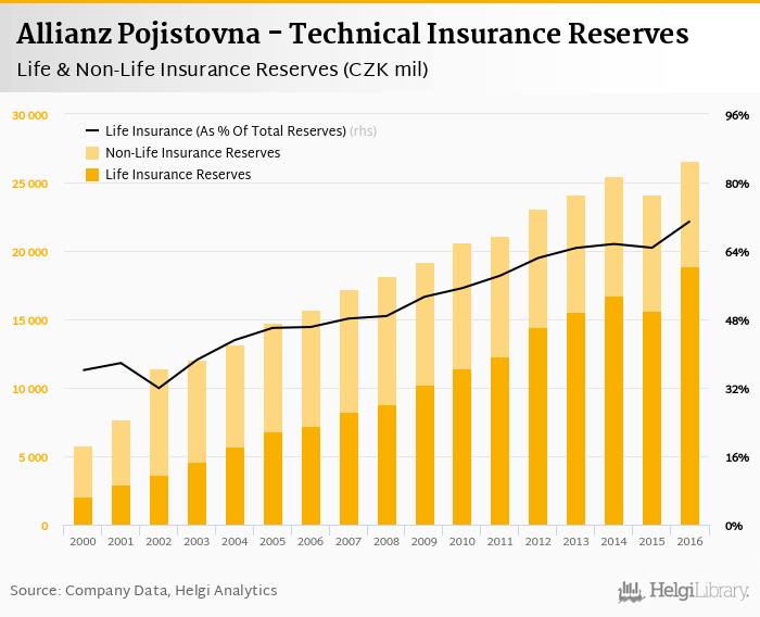 Historically, the firm’s technical reserves reached an all time high of CZK 26,576 mil in 2016 and an all time low of CZK 5,761 mil in 2000.