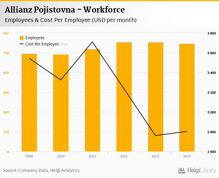 Allianz Pojistovna employed 818 persons in 2014, down 1.56% when compared to the previous year. Historically, the firm's workforce hit an all time high of 831 persons in 2013 and an all time low of 738 in 2010.