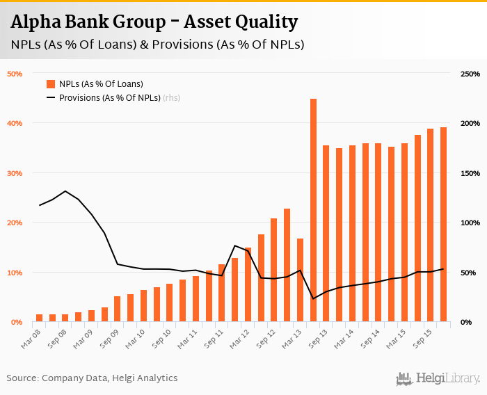 Comparing Alpha Bank Group with its closest peers, National Bank of Greece operated at the end of 2015-12-31 with NPL ratio of 42.5% and provision coverage of 74.6%, Piraeus Bank Group with 39.5% and 65.0% respectively and Eurobank Group had 33.8% of bad loans covered with 67.4% by provisions at the end of 2015-12-31.