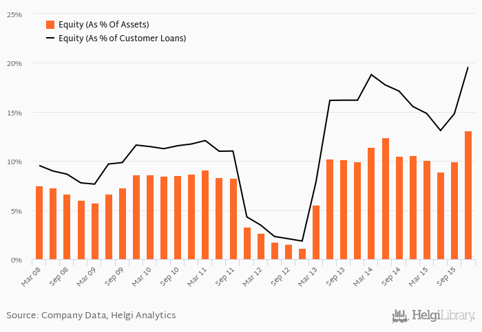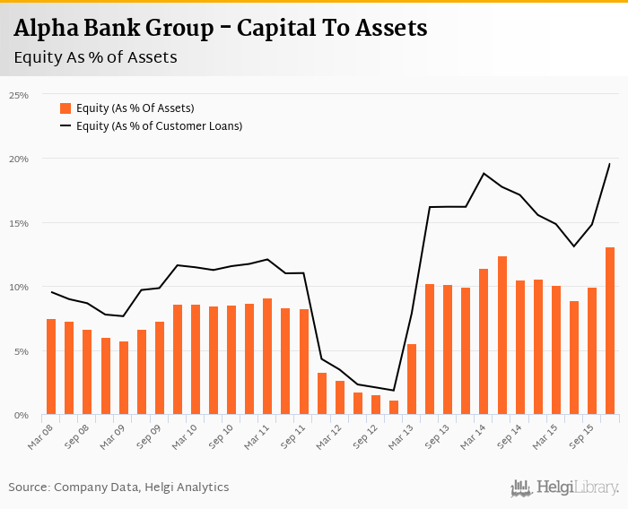 Alpha Bank Group's Equity reached 8.81% of total assets in the 4Q2015, down from 8.99% for the previous year. As a share of net customer loans, the ratio amounted to 25.1% at the end of the fourth quarter of 2015.