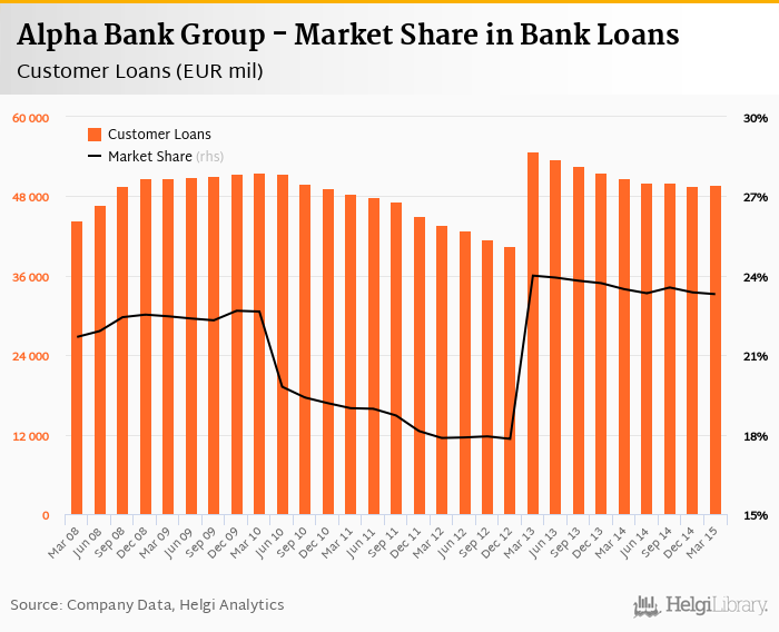 Alpha Bank Group accounted for 23.3% of all customer loans issued in Greece at the end of 2015-03-31. Historically, the bank’s market share in customer loans reached an all time high of 24.0% in 2013-03-31 and an all time low of 17.8% in 2012-12-31.