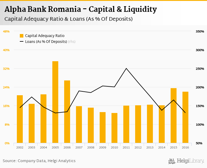 Comparing Alpha Bank Romania with its closest peers, BRD Groupe Societe Generale ended the year 2016 with a capital adequacy ratio at 20.4% and loans to deposits of 66.0% and Raiffeisen Bank Romania with 16.6% and 74.9% respectively.