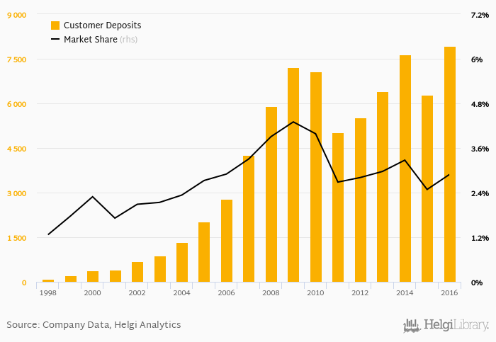 Alpha Bank Romania accounted for 2.89% of all customer deposits taken by banks in Romania at the end of 2016. Historically, the bank’s market share in customer deposits reached an all time high of 4.30% in 2009 and an all time low of 1.27% in 1998.