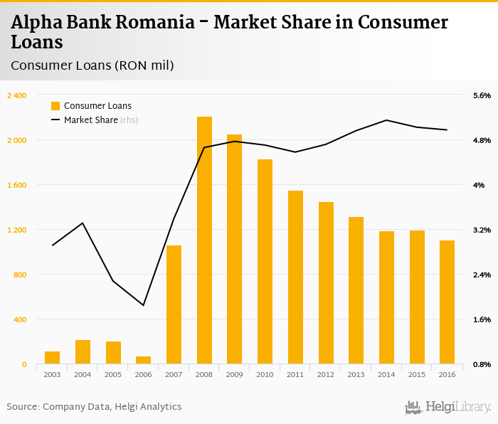 Alpha Bank Romania accounted for 4.97% of all consumer loans issued in Romania at the end of 2016. Historically, the bank’s market share in consumer loans reached an all time high of 5.14% in 2014 and an all time low of 1.84% in 2006.