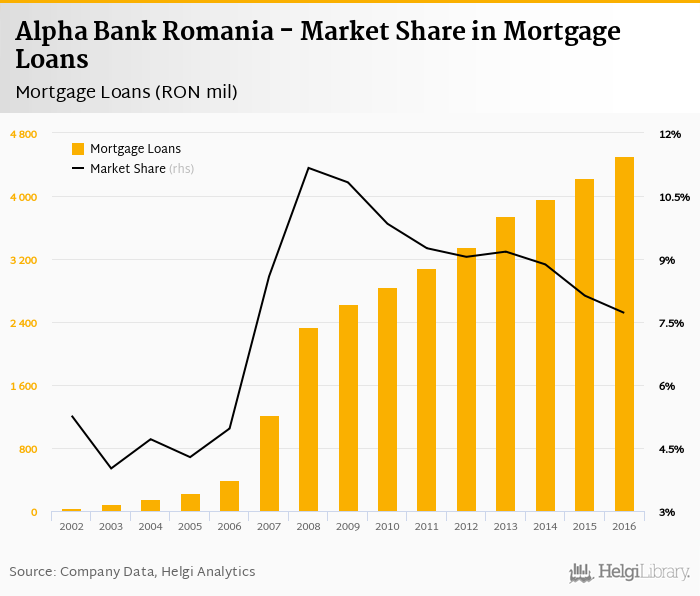 Alpha Bank Romania accounted for 7.72% of all mortgage loans issued in Romania at the end of 2016. Historically, the bank’s market share in mortgage loans reached an all time high of 11.2% in 2008 and an all time low of 4.01% in 2003.