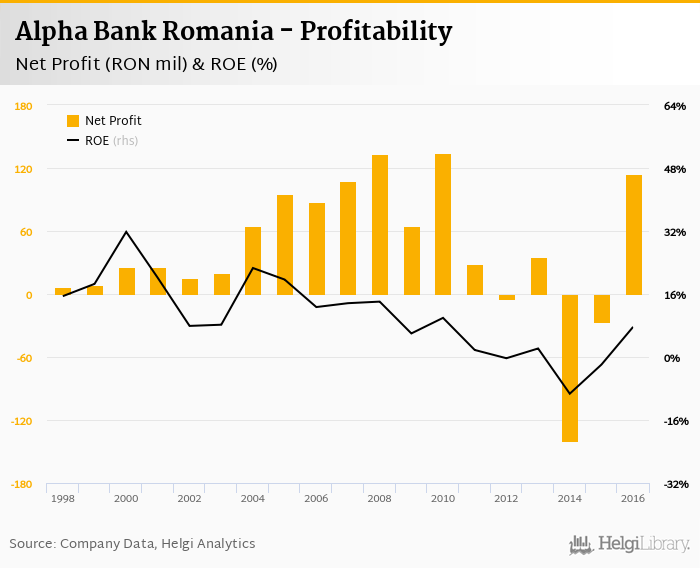 Comparing Alpha Bank Romania with its closest peers, Banca Commerciala Romana generated a net profit of RON 1,042 mil with ROE of 16.4% in 2016, BRD Groupe Societe Generale netted RON 758 mil (ROE of 11.7%) and Raiffeisen Bank Romania announced a net profit of RON 449 mil implying ROE of 13.9%.