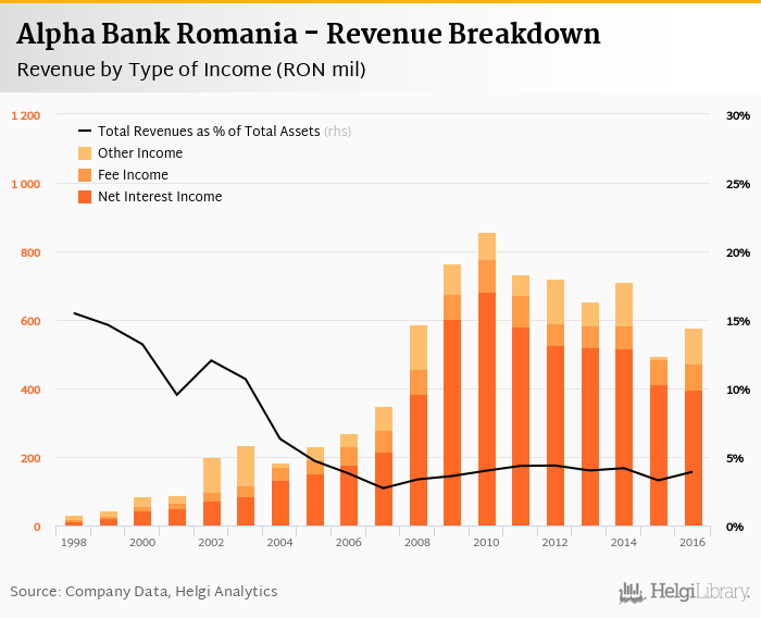Comparing Alpha Bank Romania with its closest peers, Banca Commerciala Romana generated total revenues of 4.25% of assets in 2016, BRD Groupe Societe Generale operated with 5.35% revenue margin and Raiffeisen Bank Romania produced total income worth 6.49% of assets.