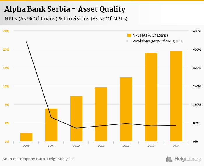 Comparing Alpha Bank Serbia with its closest peers, Komercijalna Banka Beograd operated at the end of 2014 with NPL ratio of 21.9% and provision coverage of 49.2%, Bank Intesa Serbia with 20.2% and 50.3% respectively and Raiffeisenbank Serbia had 12.9% of bad loans covered with 73.7% by provisions at the end of 2014.