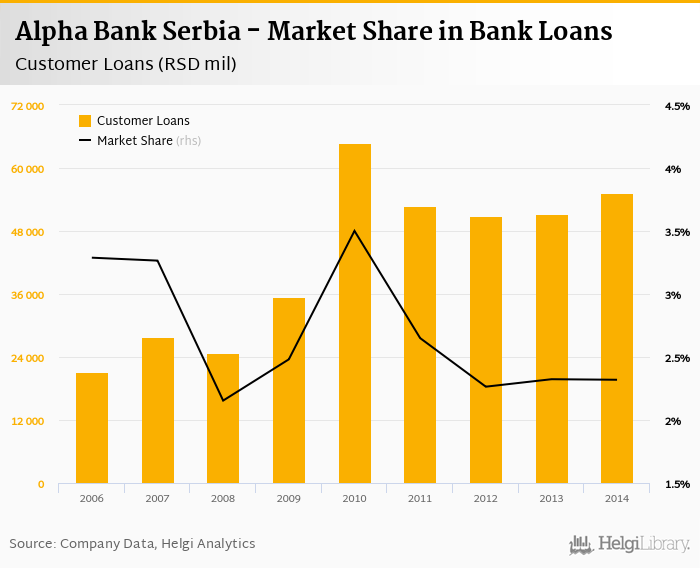 Alpha Bank Serbia accounted for 2.32% of all customer loans issued in Serbia at the end of 2014. Historically, the bank’s market share in customer loans reached an all time high of 3.50% in 2010 and an all time low of 2.15% in 2008.