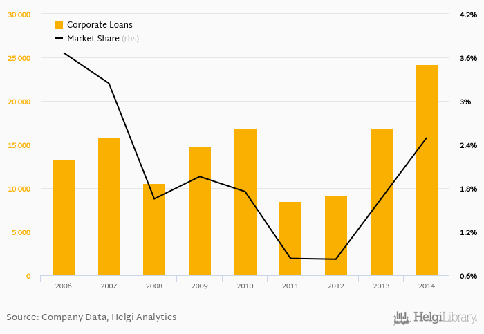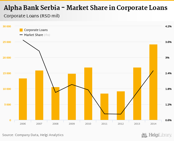 Alpha Bank Serbia accounted for 2.49% of all corporate loans issued in Serbia at the end of 2014. Historically, the bank’s market share in corporate loans reached an all time high of 3.67% in 2006 and an all time low of 0.821% in 2012.
