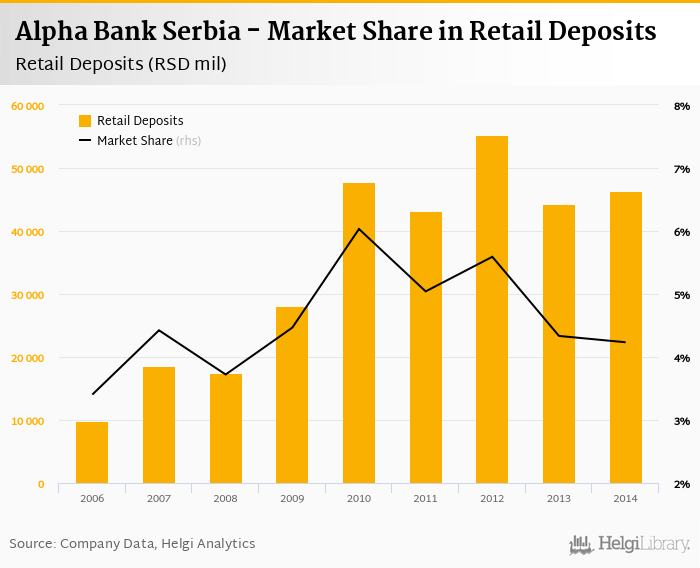 Alpha Bank Serbia accounted for 4.23% of all retail deposits taken by banks in Serbia at the end of 2014. Historically, the bank’s market share in retail deposits reached an all time high of 6.03% in 2010 and an all time low of 3.40% in 2006.