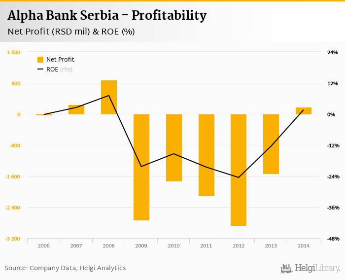 Alpha Bank Serbia made a net profit of RSD 183 mil in 2014, up 112% compared to the previous year. This implies a return on equity of 1.58%.