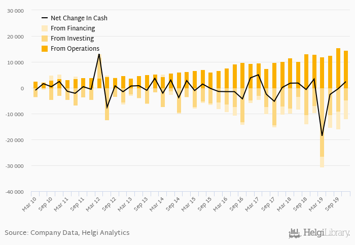 Cash from financing amounted to USD -7,326 mil, so the company generated USD 2,398 mil net cash in 4Q2019.