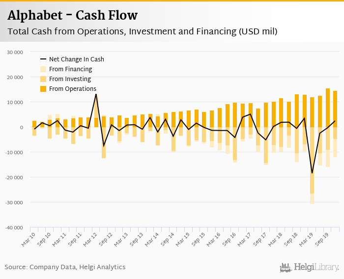 Alphabet's operating cash flow stood at USD 14,427 mil in 4Q2019, up 11.1% when compared to the previous year. Historically, between 1Q2010 - 4Q2019, the firm’s operating cash flow reached a high of USD 15,466 mil in 3Q2019 and a low of USD 2,085 mil in 2Q2010.