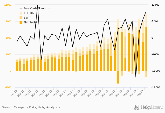On the operating level, EBITDA reached USD 12,348 mil, up 16.4% compared to the previous year. Over the last five years, the company's EBITDA has risen 17.9% a year on average.