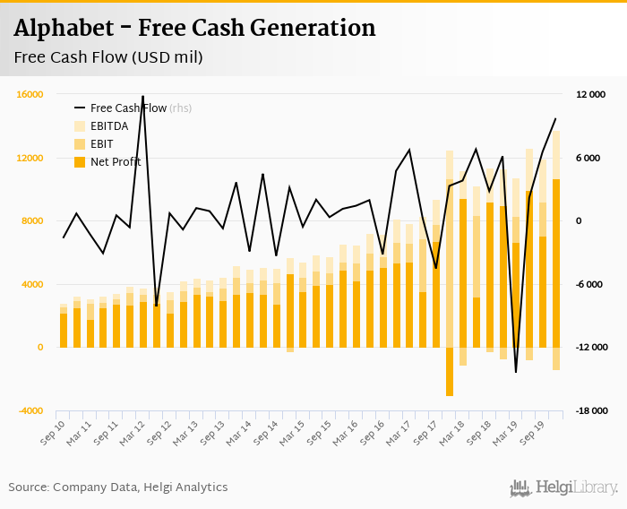 Alphabet made a net profit of USD 10,671 mil with revenues of USD 46,075 mil in 4Q2019, up by 19.3% and up by 17.3%, respectively, compared to the previous year. This translates into a net margin of 21.2%.