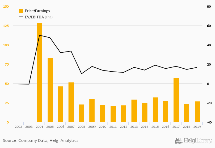 At the end of 2019, the firm traded at price to earnings of 26.8x. Over the last five years, this multiple achieved a high of 57.6x in 2017 and a low of 23.5x in 2018 with an average of 33.6x.