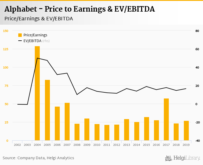 Alphabet stock traded at USD 1,237 per share at the end 2019 translating into a market capitalization of USD 921,949 mil.