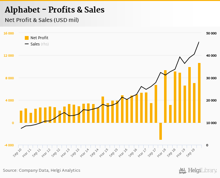 Alphabet made a net profit of USD 10,671 mil in 4Q2019, up 19.3% compared to the previous year. Total sales reached USD 46,075 mil, which is up 17.3% when compared to the previous year.
