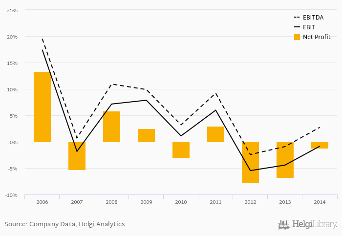 On the operating level, the EBITDA margin reached 2.73% and EBIT amounted to -0.856% of sales in 2014.