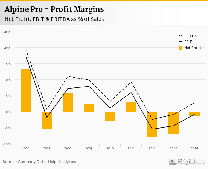 Alpine Pro made a net profit of CZK -9.16 mil with revenues of CZK 749 mil in 2014, up by 83.9% and down by 11%, respectively, compared to the previous year.