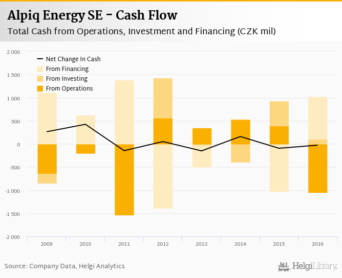 Cash from financing amounted to CZK 913 mil, so the company generated CZK -27.5 mil net cash in 2016.
