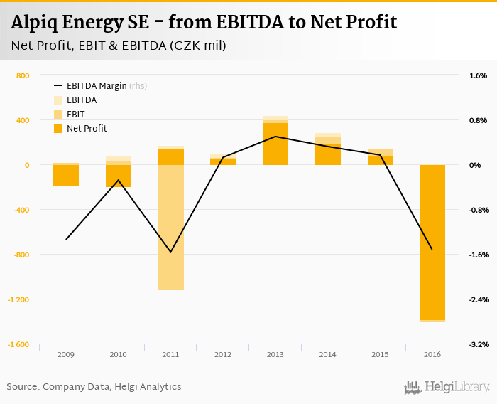 Alpiq Energy SE made a net profit of CZK -1,383 mil with revenues of CZK 91,218 mil in 2016, down by 1% and up by 7.35%, respectively, compared to the previous year. This translates into a net margin of -1.52%.