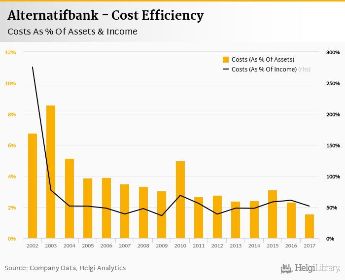 Alternatifbank's cost to income ratio reached 51.4% in 2017, down from 60.9% compared to the previous year.