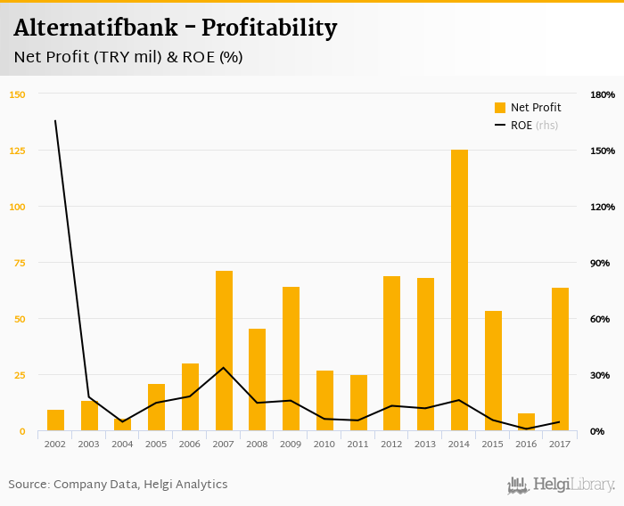 Alternatifbank made a net profit of TRY 63.9 mil in 2017, up 694% compared to the previous year. This implies a return on equity of 4.49%.