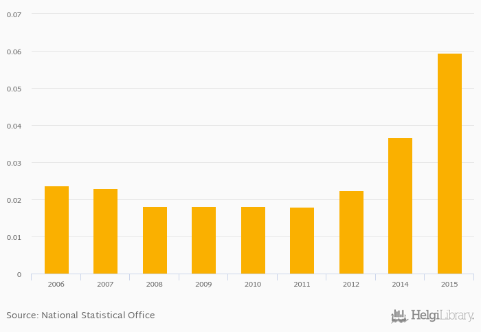 Historically, alternative fuel passenger cars as a percentage of total cars in Spain reached an all time high of 0.059% in 2015 and an all time low of 0.018% in 2011.
