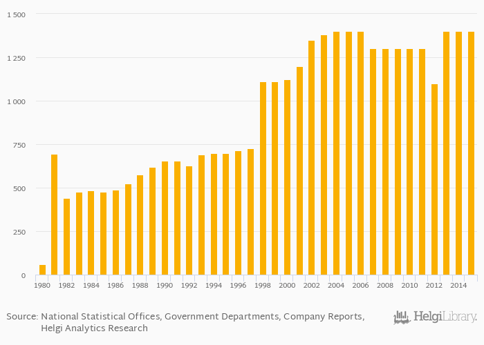 Historically, alumina production in Spain reached an all time high of 1,400 kt in 2015 and an all time low of 58.0 kt in 1980.