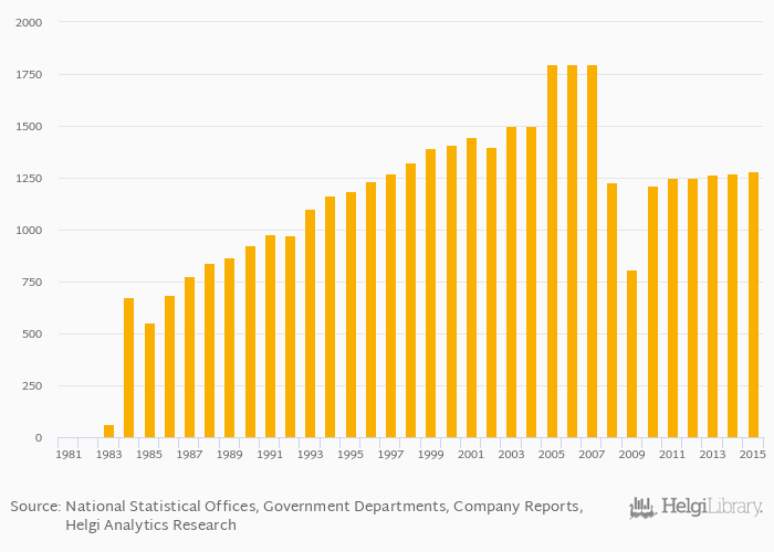 Alumina production rose 0.970% to 1,283 kt in Ireland in 2015, according to the National Statistical Office.