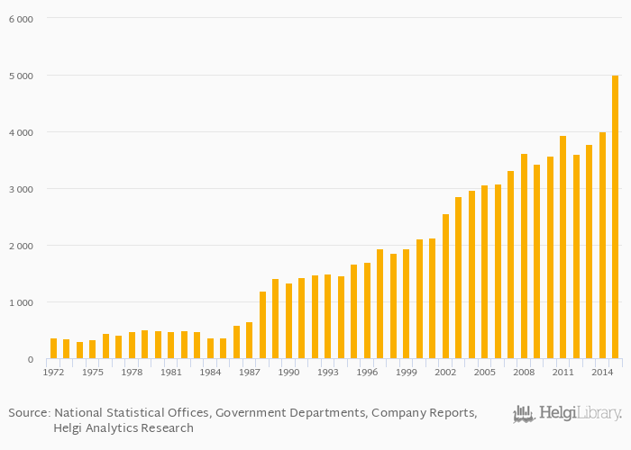 Historically, alumina production in India reached an all time high of 5,000 kt in 2015 and an all time low of 299 kt in 1974.