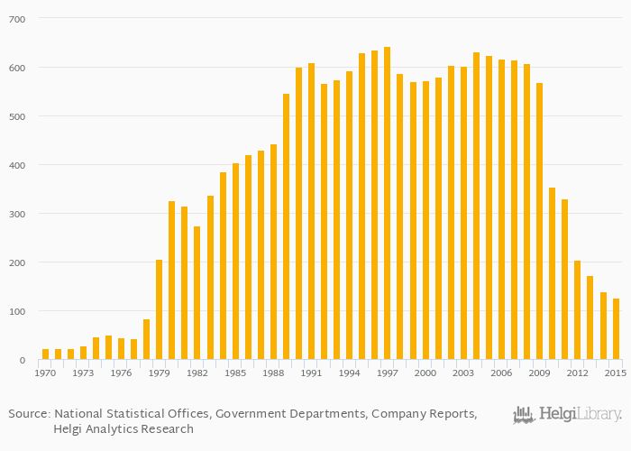 Historically, primary aluminium production in Venezuela reached an all time high of 642 kt in 1997 and an all time low of 22.0 kt in 1971.
