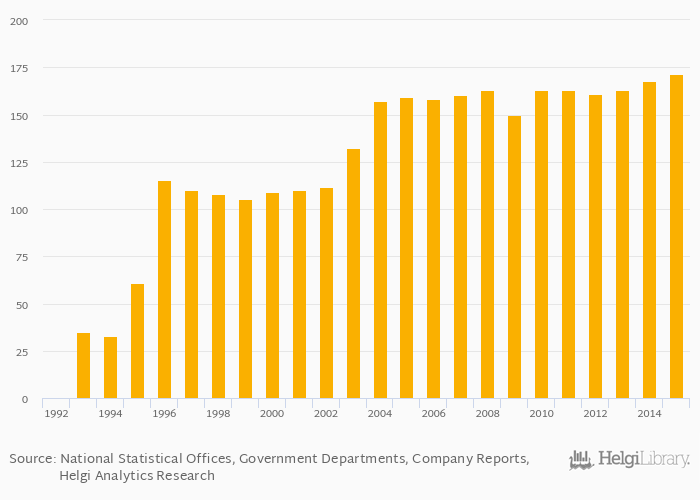 Historically, primary aluminium production in Slovakia reached an all time high of 171 kt in 2015 and an all time low of 0 kt in 1992.