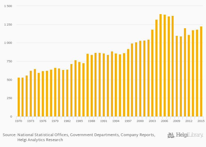 Historically, primary aluminium production in Norway reached an all time high of 1,391 kt in 2005 and an all time low of 530 kt in 1970.