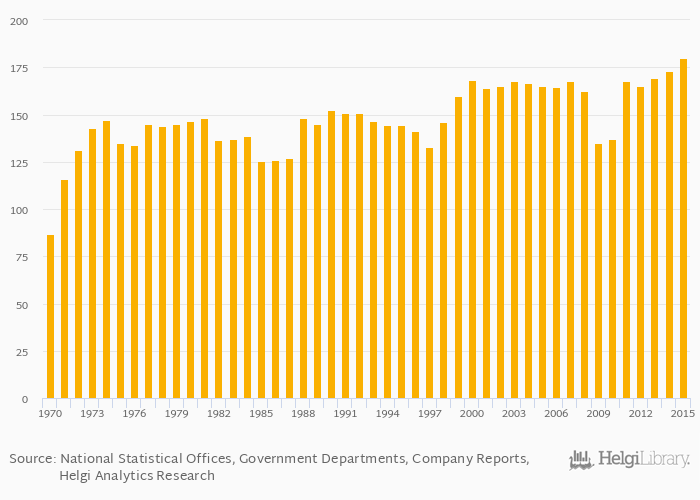Historically, primary aluminium production in Greece reached an all time high of 180 kt in 2015 and an all time low of 87.0 kt in 1970.